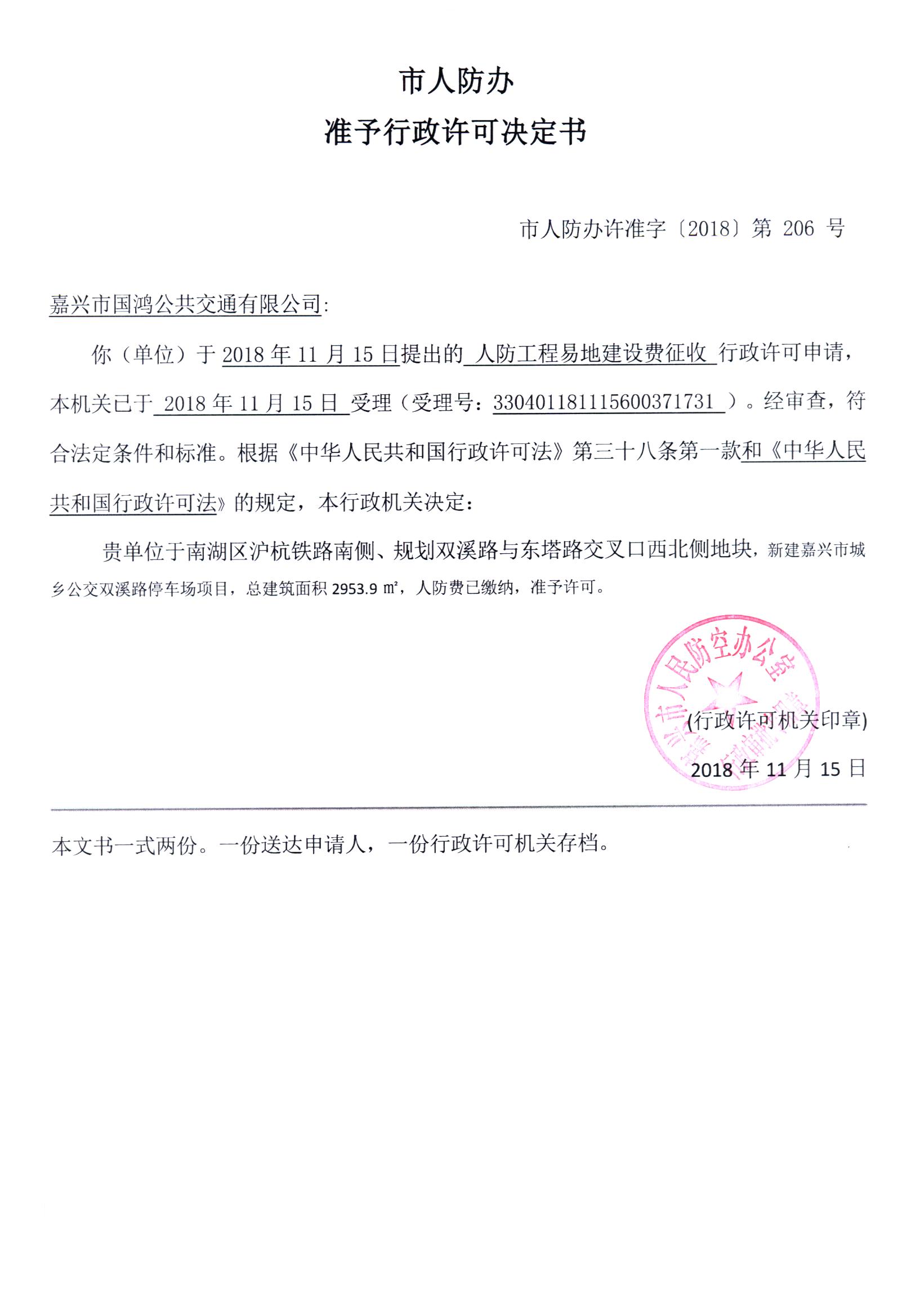 嘉興市城鄉公交雙溪路停車場工程人防許可